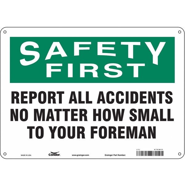Safety Sign, 10 in Height, 14 in Width, Aluminum, Horizontal Rectangle, English, 475H01SKU G5628469Categories SafetyDescription Safety Sign, Horizontal Rectangle, Number of Printed Sides 1, English, Sign Format Traditional OSHA, Sign Legend Report All Accidents No Matter How Small To Your Foreman, Sign Legend Background Color White, Sign Legend Style TextgraingerSKU: 475H01, mscSKU: , zoro_no: G5628469, mongo_id: 65bbe6753aaddbd5a902f3ed