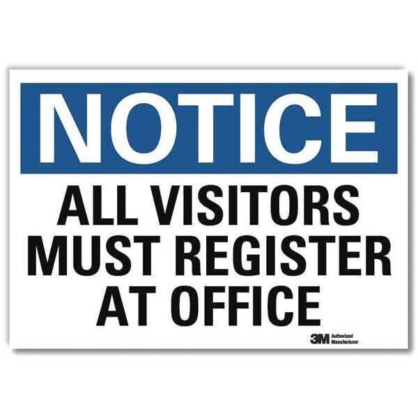 Notice Sign, 10 in H, 14 in W, Reflective Sheeting, Horizontal Rectangle, English, U5-1064-RD_14X10SKU G2764776Categories SafetyDescription Notice Sign, Horizontal Rectangle, Number of Printed Sides 1, English, Sign Legend All Visitors Must Register At Office, Sign Legend Background Color White, Sign Legend Style TextgraingerSKU: 34JH99, mscSKU: , zoro_no: G2764776, mongo_id: 65bbe6743aaddbd5a902eee9