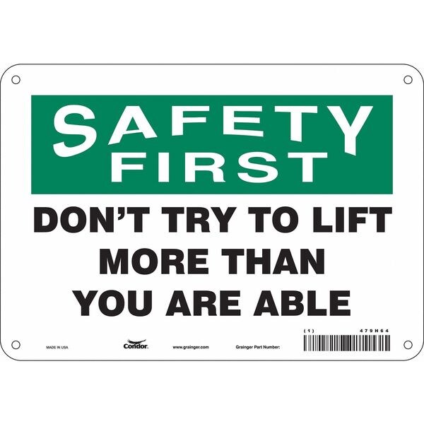 Safety Sign, 7 in Height, 10 in Width, Aluminum, Vertical Rectangle, English, 479H64SKU G5861307Categories SafetyDescription Safety Sign, Vertical Rectangle, Number of Printed Sides 1, English, Sign Format Traditional OSHA, Sign Legend Don'T Try To Lift More Than You Are Able, Sign Legend Background Color White, Sign Legend Style TextgraingerSKU: 479H64, mscSKU: , zoro_no: G5861307, mongo_id: 65bbe85f9a749db82278a140