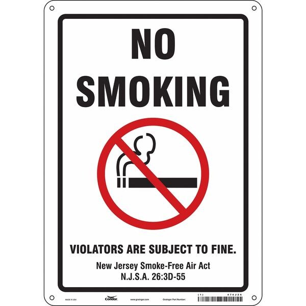 SKU G5128407Categories SafetyDescription Safety Sign, Vertical Rectangle, Number of Printed Sides 1, English, Sign Format Other Format, Sign Legend (No Smoking) Violators Are Subject To Fine. New Jersey Smoke-Free Air Act N.J.S.A 26:3D-55, Sign Legend Background Color White, Sign Legend Style Symbol and TextgraingerSKU: 474J26, mscSKU: , zoro_no: G5128407, mongo_id: 65bbe85f9a749db82278a0df
