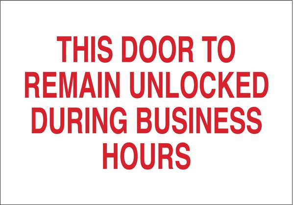 SKU G8443771Categories SafetyDescription Facility Traffic Sign, Sign Subject Matter Door Instruction, Height 10 In., Width 14 In., Sign Material Plastic, Sign Mounting Style With Mounting Holes, Header No Header, Legend This Door To Remain Unlocked During Business Hours, Printed Language English, Sign Shape Rectangle$17.49 / eachWeb priceFacility Traffic Sign, 10" Height, 14" Width, Plastic, Rectangle, EnglishSKU G8443771Categories SafetyDescription Facility Traffic Sign, Sign Subject Matter Door Instruction, Height 10 In., Width 14 In., Sign Material Plastic, Sign Mounting Style With Mounting Holes, Header No Header, Legend This Door To Remain Unlocked During Business Hours, Printed Language English, Sign Shape Rectangle$17.49 / eachWeb price -