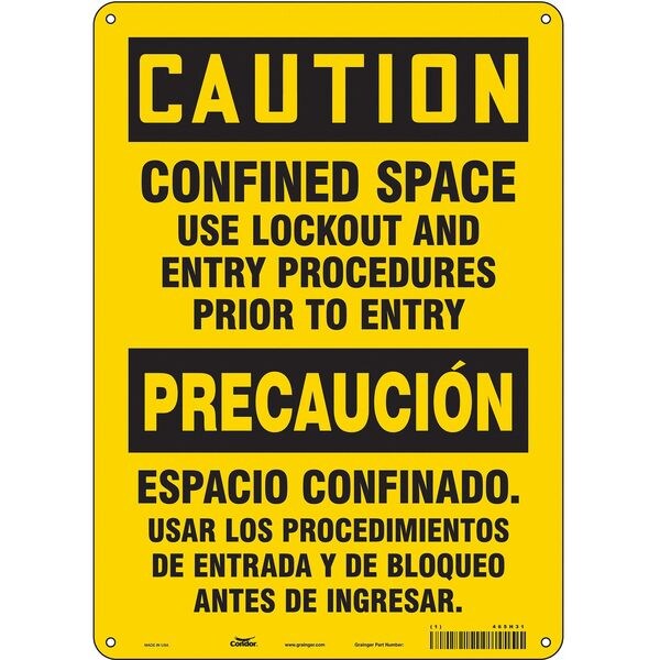 Safety Sign, 10" H, 14" W, Aluminum, 465H31SKU G5268230Categories SafetyDescription Safety Sign, Horizontal Rectangle, Number of Printed Sides 1, English, Spanish, Sign Format Traditional OSHA, Sign Legend Confined Space Use Lockout And Entry Procedures Prior To Entry/Espacio Confinado. Usar Los Procedimientos De Entrada Y De Bloqueo Antes De Ingresar, Sign Legend Background Color Yellow, Sign Legend Style TextgraingerSKU: 465H31, mscSKU: , zoro_no: G5268230, mongo_id: 65bbe85f9a749db822789f98