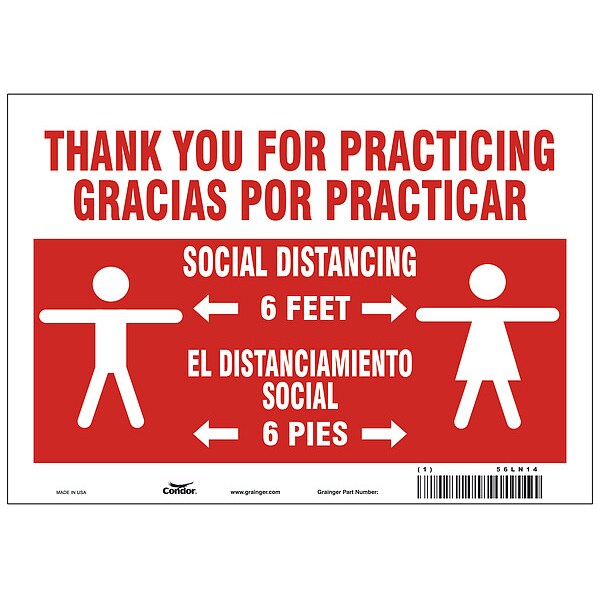 SKU G7660415Categories SafetyDescription Covid 19 Sign 7X10, Eng/Span Practice So, Sign Subject Matter Coronavirus Prevention, Height 7 in, Width 10 in, Sign Material Aluminum, Sign Mounting Style With Mounting Holes, Header Thank You For Practicing/Gracias Por Practicar, Legend Social Distancing 6 Feet/El Distanciamiento Social 6 Pies, Printed Language English, SpanishgraingerSKU: 56LN14, mscSKU: , zoro_no: G7660415, mongo_id: 65bbe85f9a749db822789f6f