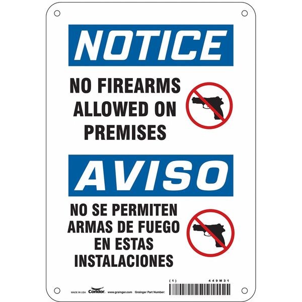 Safety Sign, 10 in Height, 7 in Width, Aluminum, Horizontal Rectangle, English, 449M31SKU G5241323Categories SafetyDescription Safety Sign, Horizontal Rectangle, Number of Printed Sides 1, English, Sign Legend No Firearms Allowed On Premises/No Se Permiten Armas De Fuego En Estas Instalaciones, Sign Legend Background Color White, Sign Legend Style Symbol and TextgraingerSKU: 449M31, mscSKU: , zoro_no: G5241323, mongo_id: 65bbe85f9a749db822789f73