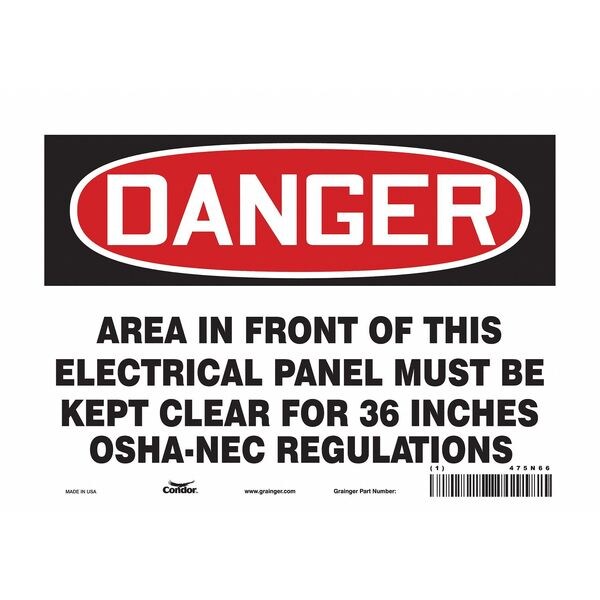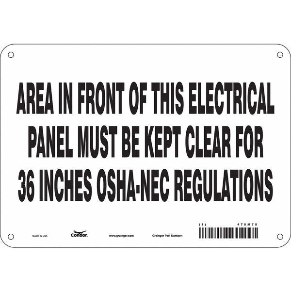 Safety Sign, 7 in Height, 10 in Width, Aluminum, Vertical Rectangle, English, 475N66SKU G5089152Categories SafetyDescription Safety Sign, Vertical Rectangle, Number of Printed Sides 1, English, Sign Format Traditional OSHA, Sign Legend Area In Front Of This Electrical Panel Must Be Kept Clear For 36 Inches Osha-Nec Regulations, Sign Legend Background Color White, Sign Legend Style TextgraingerSKU: 475N66, mscSKU: , zoro_no: G5089152, mongo_id: 65bbe85f9a749db822789f55