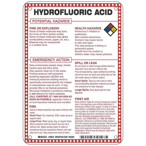 Chemical Sign, 10 in Height, 7 in Width, RectangleSKU G5709566Categories SafetyDescription Chemical Sign, Hydrofluoric Acid Potential Hazards, Fiberglass, Height 10 in, Width 7 in, Header No Header, Legend Style Symbol and Text, Language English, Mounting Style Surface, Thickness 0.1 in, Sign Shape Rectangle, Operating Temp. Range -40 Degrees to 194 Degrees F, Retroreflective Grade Not RetroreflectivegraingerSKU: 41F483, mscSKU: , zoro_no: G5709566, mongo_id: 65bbe84622d7a989a98e839e