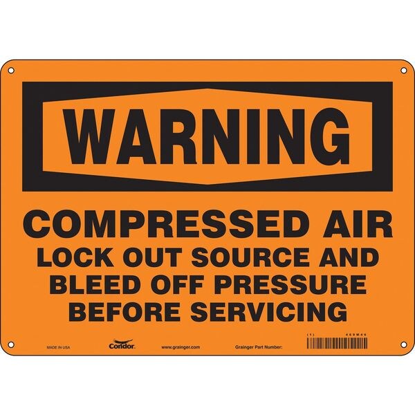 Safety Sign, 10 in Height, 14 in Width, Aluminum, Horizontal Rectangle, English, 469M46SKU G5591122Categories SafetyDescription Safety Sign, Horizontal Rectangle, Number of Printed Sides 1, English, Sign Format Traditional OSHA, Sign Legend Compressed Air Lock Out Source And Bleed Off Pressure Before Servicing, Sign Legend Background Color Orange, Sign Legend Style TextgraingerSKU: 469M46, mscSKU: , zoro_no: G5591122, mongo_id: 65bbe85f22d7a989a98ee059