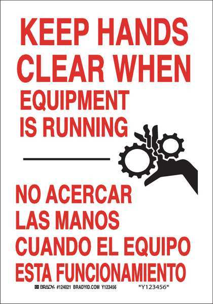 SKU G8447551Categories SafetyDescription Bilingual Safety Sign, Sign Subject Matter Keep Hands Clear, Height 14 in, Width 10 in, Sign Material Polyester, Sign Mounting Style Adhesive Surface, Header No Header, Legend Keep Hands Clear When Equipment Is Running/No Acer, Printed Language English, Spanish, Sign Shape Rectangle$16.99 / eachWeb priceBilingual Safety Sign, 14 in Height, 10 in Width, Polyester, Rectangle, English, SpanishSKU G8447551Categories SafetyDescription Bilingual Safety Sign, Sign Subject Matter Keep Hands Clear, Height 14 in, Width 10 in, Sign Material Polyester, Sign Mounting Style Adhesive Surface, Header No Header, Legend Keep Hands Clear When Equipment Is Running/No Acer, Printed Language English, Spanish, Sign Shape Rectangle$16.99 / eachWeb price -