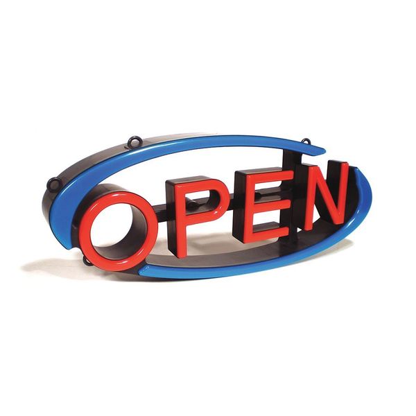 SKU G1862012Categories SafetyDescription LED Open Sign, Voltage 100 to 240, Watts 14 W, Length 22 1/2 in, Width 2 3/4 in, Height 9 in, Legend/Background Color Red/Blue, Material Plastic, Temp. Range -40 Degrees F to 90 Degrees F, Rated Life 50,000 hr, Includes Power Supply, Hanging Chains and Remote with Battery, Warranty 2 yr$188.74 / eachWeb price