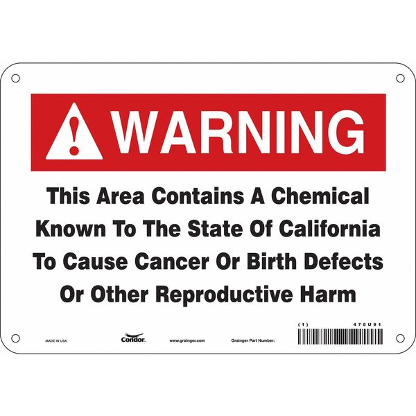 SKU G5804543Categories SafetyDescription Safety Sign, THIS AREA CONTAINS A CHEMICAL KNOWN TO THE STATE OF CALIFORNIA TO CAUSE CANCER OR BIRTH DEFECTS OR OTHER REPRODUCTIVE HARM, Aluminum, Height 7 in, Width 10 in, Header No Header, Legend Style Text, Thickness 0.032 in, Sign Shape Rectangle, Operating Temp. Range -40 Degrees to 140 Degrees F, Retroreflective Grade Not RetroreflectivegraingerSKU: 475U91, mscSKU: , zoro_no: G5804543, mongo_id: 65bbe81b22d7a989a98d9ef8