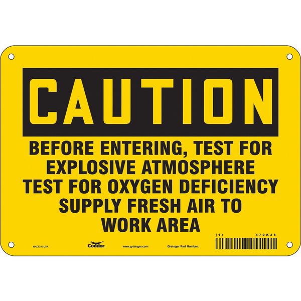 $18.74 / eachWeb priceSafety Sign, 7 in Height, 10 in Width, Aluminum, Vertical Rectangle, English, 470K36SKU G5776412Categories SafetyDescription Safety Sign, Vertical Rectangle, Number of Printed Sides 1, English, Sign Format Traditional OSHA, Sign Legend Before Entering, Test For Explosive Atmosphere Test For Oxygen Deficiency Supply Fresh Air To Work Area, Sign Legend Background Color Yellow, Sign Legend Style TextgraingerSKU: 470K36, mscSKU: , zoro_no: G5776412, mongo_id: 65bbe7da9a749db82275f0f5
