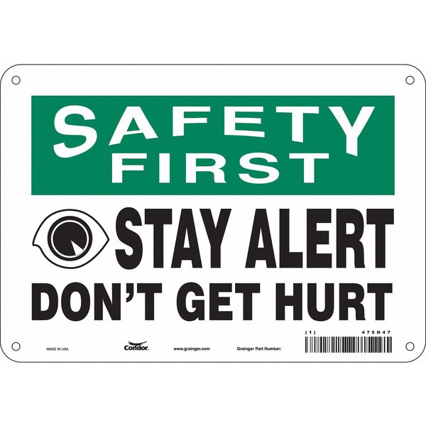 $18.74 / eachWeb priceSafety Sign, 7 in Height, 10 in Width, Aluminum, Vertical Rectangle, English, 475H47SKU G5252550Categories SafetyDescription Safety Sign, Vertical Rectangle, Number of Printed Sides 1, English, Sign Format Traditional OSHA, Sign Legend Stay Alert Don'T Get Hurt, Sign Legend Background Color White, Sign Legend Style Symbol and TextgraingerSKU: 475H47, mscSKU: , zoro_no: G5252550, mongo_id: 65bbe7da9a749db82275f0a6