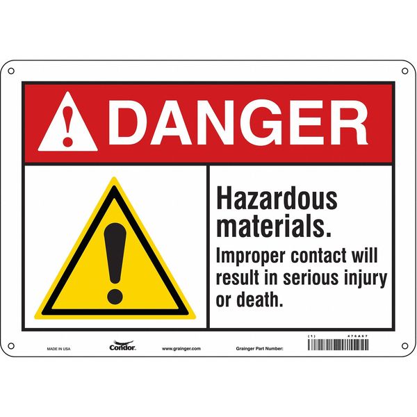 $25.19 / eachWeb priceSafety Sign, 10 in Height, 14 in Width, Aluminum, Horizontal Rectangle, English, 476A67SKU G5814413Categories SafetyDescription Safety Sign, Horizontal Rectangle, Number of Printed Sides 1, English, Sign Format ANSI/OSHA Format, Sign Legend Hazardous Materials. Improper Contact Will Result In Serious Injury Or Death., Sign Legend Background Color White, Sign Legend Style Symbol and TextgraingerSKU: 476A67, mscSKU: , zoro_no: G5814413, mongo_id: 65bbe7da9a749db82275f08f