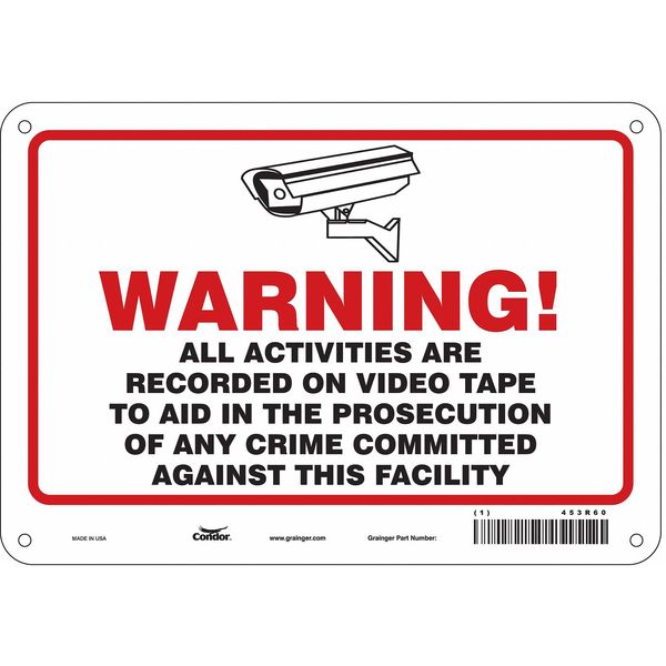 SKU G5904363Categories SafetyDescription Security Sign, Vertical Rectangle, Number of Printed Sides 1, English, Sign Legend Warning All Activities Are Recorded On Video Tape To Aid In The Prosecution Of Any Crime Committed Against This Facility, Sign Legend Background Color White, Sign Legend Style Symbol and TextgraingerSKU: 453R60, mscSKU: , zoro_no: G5904363, mongo_id: 65bbe7da9a749db82275ef37