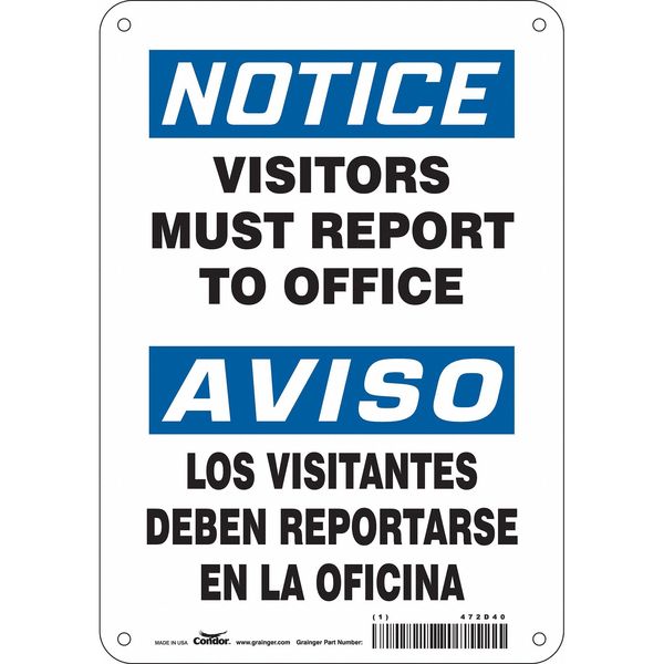 $14.44 / eachWeb priceSafety Sign, 10 in Height, 7 in Width, Aluminum, Horizontal Rectangle, English, Spanish, 472D40SKU G5182648Categories SafetyDescription Safety Sign, Horizontal Rectangle, Number of Printed Sides 1, English, Spanish, Sign Legend Visitors Must Report To Office/Los Visitantes Deben Reportarse En La Oficina, Sign Legend Background Color White, Sign Legend Style TextgraingerSKU: 472D40, mscSKU: , zoro_no: G5182648, mongo_id: 65bbe7da9a749db82275ef4f
