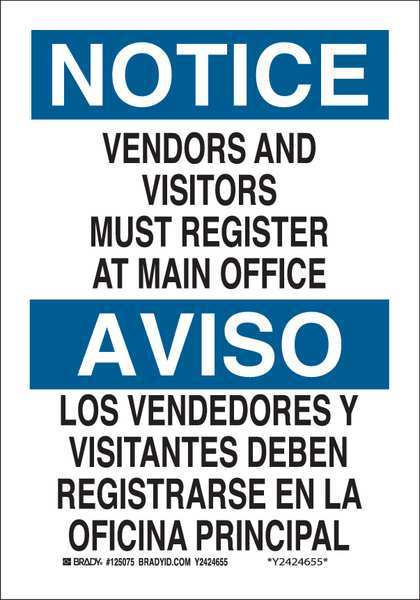 SKU G7380672Categories SafetyDescription Bilingual Safety Sign, Sign Subject Matter Employees and Visitors, Height 10 in, Width 7 in, Sign Material Polyester, Sign Mounting Style Adhesive Surface, Header Notice/Aviso, Legend Vendors And Visitors Must Register At Main Office/Los Vendedores Y Visitantes Deben Registrarse En La Oficina Principal, Printed Language English, Spanish, Sign Shape Rectangle$11.49 / eachWeb priceBilingual Safety Sign, 10 in H, 7 in W, Polyester, Rectangle, English, Spanish, 125075SKU G7380672Categories SafetyDescription Bilingual Safety Sign, Sign Subject Matter Employees and Visitors, Height 10 in, Width 7 in, Sign Material Polyester, Sign Mounting Style Adhesive Surface, Header Notice/Aviso, Legend Vendors And Visitors Must Register At Main Office/Los Vendedores Y Visitantes Deben Registrarse En La Oficina Principal, Printed Language English, Spanish, Sign Shape Rectangle$11.49 / eachWeb price -