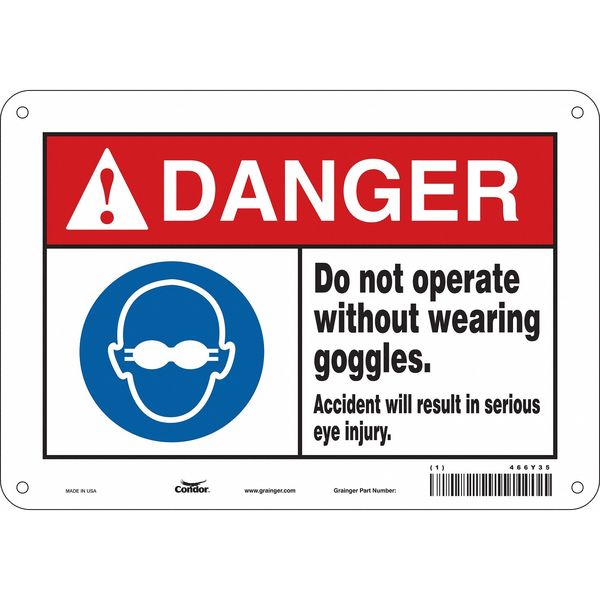 $18.74 / eachWeb priceSafety Sign, 7 in Height, 10 in Width, Aluminum, Vertical Rectangle, English, 466Y35SKU G5773299Categories SafetyDescription Safety Sign, Vertical Rectangle, Number of Printed Sides 1, English, Sign Format ANSI/OSHA Format, Sign Legend Do Not Operate Without Wearing Goggles. Accident Will Result In Serious Eye Injury, Sign Legend Background Color White, Sign Legend Style Symbol and TextgraingerSKU: 466Y35, mscSKU: , zoro_no: G5773299, mongo_id: 65bbe7da9a749db82275ef33