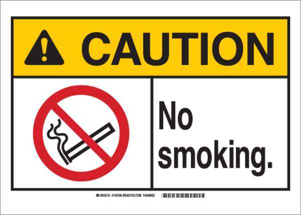 SKU G7419367Categories SafetyDescription Caution No Smoking Sign, Sign Subject Matter No Smoking, Height 7 in, Width 10 in, Sign Material Plastic, Sign Mounting Style With Mounting Holes, Header Caution, Legend No Smoking., Printed Language English, Sign Shape Rectangle$11.94 / eachWeb priceCaution No Smoking Sign, 7" H, 10" W, Plastic, Rectangle, English, 143766SKU G7419367Categories SafetyDescription Caution No Smoking Sign, Sign Subject Matter No Smoking, Height 7 in, Width 10 in, Sign Material Plastic, Sign Mounting Style With Mounting Holes, Header Caution, Legend No Smoking., Printed Language English, Sign Shape Rectangle$11.94 / eachWeb price -