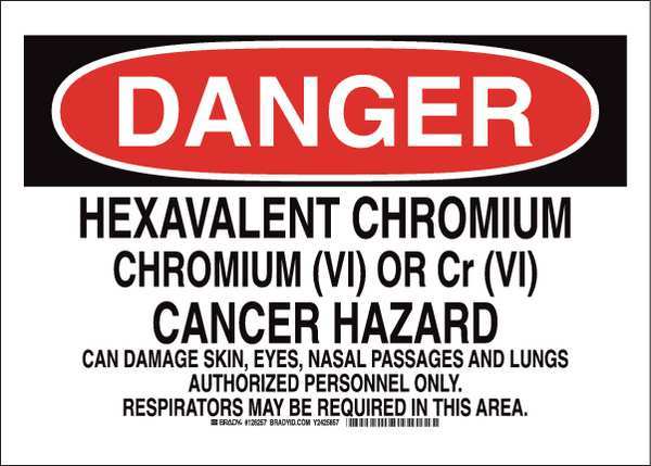 SKU G7418603Categories SafetyDescription Danger Sign, Sign Subject Matter Health Hazard, Height 10 in, Width 14 in, Sign Material Polyester, Sign Mounting Style Adhesive Surface, Header Danger, Legend Hexavalent Chromium Chromium (Vi) Or Cr (Vi) Cancer Hazard Can Damage Skin, Eyes, Nasal Passages And Lungs. Authorized Personnel Only. Respirators May Be Required In This Area., Printed Language English, Sign Shape Rectangle$29.99 / eachWeb priceDanger Sign, 10 in H, 14 in W, Polyester, Rectangle, English, 126257SKU G7418603Categories SafetyDescription Danger Sign, Sign Subject Matter Health Hazard, Height 10 in, Width 14 in, Sign Material Polyester, Sign Mounting Style Adhesive Surface, Header Danger, Legend Hexavalent Chromium Chromium (Vi) Or Cr (Vi) Cancer Hazard Can Damage Skin, Eyes, Nasal Passages And Lungs. Authorized Personnel Only. Respirators May Be Required In This Area., Printed Language English, Sign Shape Rectangle$29.99 / eachWeb price -