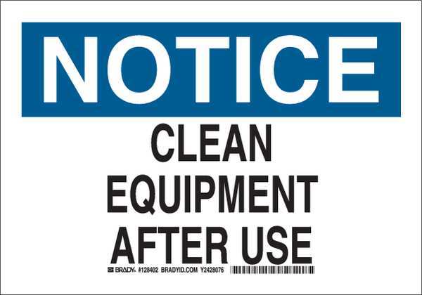 Notice Sign, 7X10", Blk and Ble/White, Legend: Clean Equipment After Use, 128402