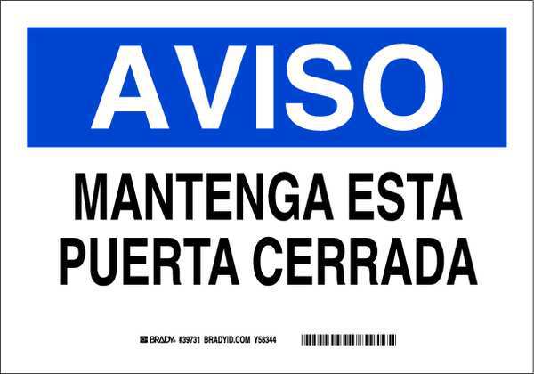 SKU G7397822Categories SafetyDescription Notice/Aviso Sign, Sign Subject Matter Door Instruction, Height 7 In., Width 10 In., Sign Material Polyester, Sign Mounting Style Adhesive Surface, Header Aviso, Legend Mantener Cerrada Esta Puerta, Printed Language Spanish, Sign Shape Rectangle$11.61 / eachWeb priceNotice/Aviso Sign, 7x10, Spanish, Header Background Color: BlueSKU G7397822Categories SafetyDescription Notice/Aviso Sign, Sign Subject Matter Door Instruction, Height 7 In., Width 10 In., Sign Material Polyester, Sign Mounting Style Adhesive Surface, Header Aviso, Legend Mantener Cerrada Esta Puerta, Printed Language Spanish, Sign Shape Rectangle$11.61 / eachWeb price -