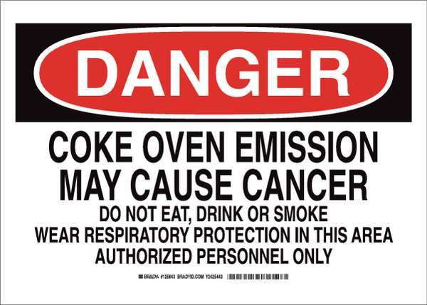 SKU G7434959Categories SafetyDescription Danger Sign, Sign Subject Matter Personal Protection, Height 10 in, Width 14 in, Sign Material Polyester, Sign Mounting Style Adhesive Surface, Header Danger, Legend Coke Oven Emission May Cause Cancer Do Not Eat, Drink Or Smoke Wear Respiratory Protection In This Area Authorized Personnel Only, Printed Language English, Sign Shape Rectangle$29.99 / eachWeb priceDanger Sign 10X14, 125843SKU G7434959Categories SafetyDescription Danger Sign, Sign Subject Matter Personal Protection, Height 10 in, Width 14 in, Sign Material Polyester, Sign Mounting Style Adhesive Surface, Header Danger, Legend Coke Oven Emission May Cause Cancer Do Not Eat, Drink Or Smoke Wear Respiratory Protection In This Area Authorized Personnel Only, Printed Language English, Sign Shape Rectangle$29.99 / eachWeb price -