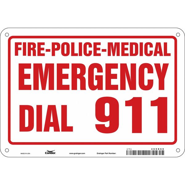 Safety Sign, 10" W, 7" H, 0.032" Thickness, 469G66SKU G5637788Categories SafetyDescription SAFETY SIGN FIRE AND EMERGENCY, Vertical Rectangle, Number of Printed Sides 1, English, Sign Legend Fire-Police-Medical Emergency Dial 911, Sign Legend Background Color White, Sign Legend Style TextgraingerSKU: 469G66, mscSKU: , zoro_no: G5637788, mongo_id: 65bbe8069a749db82276d493