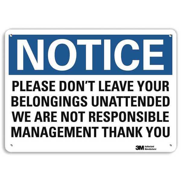 SKU G2758780Categories SafetyDescription Notice Sign, Vertical Rectangle, Number of Printed Sides 1, English, Sign Format Traditional OSHA, Sign Legend Please Don't Leave Your Belongings Unattended. We Are Not Responsible., Sign Legend Background Color White, Sign Legend Style TextgraingerSKU: 34JV11, mscSKU: , zoro_no: G2758780, mongo_id: 65bbe8069a749db82276cfe2