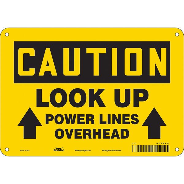 $18.74 / eachWeb priceSafety Sign, 7 in Height, 10 in Width, Aluminum, Vertical Rectangle, English, 475P49SKU G5587552Categories SafetyDescription Safety Sign, Vertical Rectangle, Number of Printed Sides 1, English, Sign Format Traditional OSHA, Sign Legend Look Up Power Lines Overhead, Sign Legend Background Color Yellow, Sign Legend Style Symbol and TextgraingerSKU: 475P49, mscSKU: , zoro_no: G5587552, mongo_id: 65bbe80722d7a989a98d1427