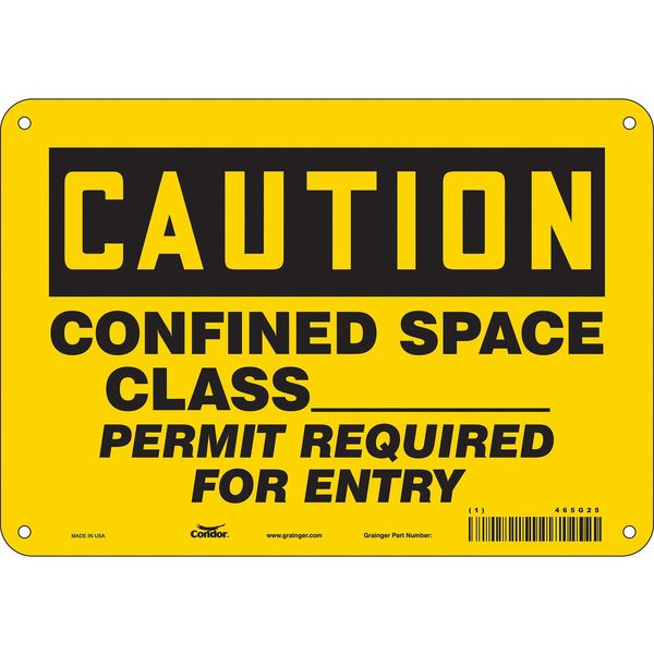 $18.74 / eachWeb priceSafety Sign, 7 in Height, 10 in Width, Aluminum, Vertical Rectangle, English, 465G25SKU G5898328Categories SafetyDescription Safety Sign, Vertical Rectangle, Number of Printed Sides 1, English, Sign Format Traditional OSHA, Sign Legend Confined Space Class ______ Permit Required For Entry, Sign Legend Background Color Yellow, Sign Legend Style TextgraingerSKU: 465G25, mscSKU: , zoro_no: G5898328, mongo_id: 65bbe80722d7a989a98d151a