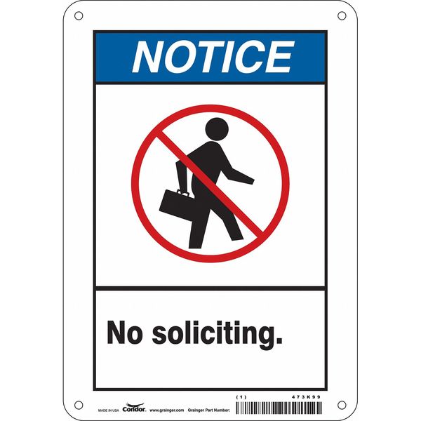 SKU G5579697Categories SafetyDescription Safety Sign, Horizontal Rectangle, Number of Printed Sides 1, English, Sign Legend No Soliciting., Sign Legend Background Color White, Sign Legend Style Symbol and TextgraingerSKU: 473K99, mscSKU: , zoro_no: G5579697, mongo_id: 65bbe80722d7a989a98d14f1