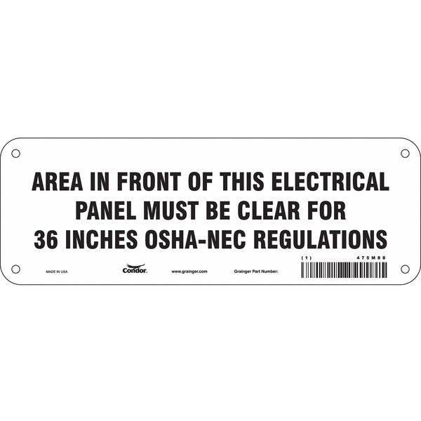 SKU G5790850Categories SafetyDescription Safety Sign, Vertical Rectangle, Number of Printed Sides 1, English, Sign Format Other Format, Sign Legend Area In Front Of This Electrical Panel Must Be Kept Clear For 36 In Osha-Nec Regulations, Sign Legend Background Color White, Sign Legend Style TextgraingerSKU: 475M88, mscSKU: , zoro_no: G5790850, mongo_id: 65bbe80722d7a989a98d136a