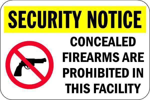 SKU G0134617Categories SafetyDescription Warning Sign, Horizontal Rectangle, Number of Printed Sides 1, English, Sign Legend Concealed Firearms Are Prohibited In This Facility, Sign Legend Background Color White, Sign Legend Style Symbol and TextgraingerSKU: 6DUV9, mscSKU: , zoro_no: G0134617, mongo_id: 65bbe80722d7a989a98d0ec4