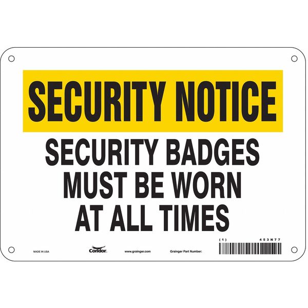 Security Sign, 7 in H, 10 in W, Aluminum, Vertical Rectangle, English, 453N77SKU G5285049Categories SafetyDescription Security Sign, Vertical Rectangle, Number of Printed Sides 1, English, Sign Format Other Format, Sign Legend Security Badges Must Be Worn At All Times, Sign Legend Background Color White, Yellow, Sign Legend Style TextgraingerSKU: 453N77, mscSKU: , zoro_no: G5285049, mongo_id: 65bbe76d3aaddbd5a9093981