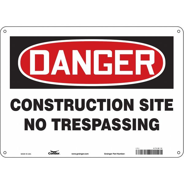 Safety Sign, 10 in Height, 14 in Width, Aluminum, Horizontal Rectangle, English, 476K10SKU G5821389Categories SafetyDescription Safety Sign, Horizontal Rectangle, Number of Printed Sides 1, English, Sign Format Traditional OSHA, Sign Legend Construction Site No Trespassing, Sign Legend Background Color White, Sign Legend Style TextgraingerSKU: 476K10, mscSKU: , zoro_no: G5821389, mongo_id: 65bbe76d3aaddbd5a9093947