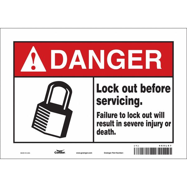 SKU G5093459Categories SafetyDescription Safety Sign, Vertical Rectangle, Number of Printed Sides 1, English, Sign Format ANSI/OSHA Format, Sign Legend Lock Out Before Servicing. Failure To Lock Out Will Result In Severe Injury Or Death., Sign Legend Background Color White, Sign Legend Style Symbol and TextgraingerSKU: 469L67, mscSKU: , zoro_no: G5093459, mongo_id: 65bbe76d3aaddbd5a909392b
