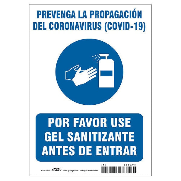 SKU G8448003Categories SafetyDescription Spanish Use Hand Sanitizer Sign, Sign Subject Matter Coronavirus Prevention, Height 14 in, Width 10 in, Sign Material Aluminum, Sign Mounting Style With Mounting Holes, Header No Header, Legend Prevenga La Propagación Del Coronavirus (Covid-19) Por Favor Use Gel Sanitizante Antes De Entrar, Printed Language Spanish, Sign Shape Rectangle$29.99 / eachWeb price