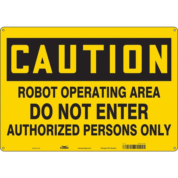Safety Sign, 14 in Height, 20 in Width, Aluminum, Horizontal Rectangle, EnglishSKU G5810959Categories SafetyDescription Safety Sign, Horizontal Rectangle, Number of Printed Sides 1, English, Sign Format Traditional OSHA, Sign Legend Robot Operating Area Do Not Enter Authorized Persons Only, Sign Legend Background Color Yellow, Sign Legend Style TextgraingerSKU: 472L18, mscSKU: , zoro_no: G5810959, mongo_id: 65bbe76d3aaddbd5a9093938