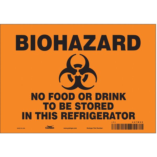 Biohazard Sign, 7 in H, 10 in W, Vinyl, Vertical Rectangle, English, 447W05SKU G6045328Categories SafetyDescription Biohazard Sign, Vertical Rectangle, Number of Printed Sides 1, English, Sign Format Other Format, Sign Legend Biohazard No Food Or Drink To Be Stored In This Refrigerator, Sign Legend Background Color Orange, Sign Legend Style Symbol and TextgraingerSKU: 447W05, mscSKU: , zoro_no: G6045328, mongo_id: 65bbe76c3aaddbd5a9093859