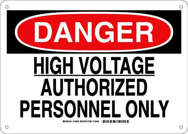 Danger Sign 10X14, Legend: High Voltage Authorized Personnel OnlySKU G7407062Categories SafetyDescription Danger Sign, Sign Subject Matter Electrical Hazard, Height 10 in, Width 14 in, Sign Material Aluminum, Sign Mounting Style With Mounting Holes, Header Danger, Legend High Voltage Authorized Personnel Only, Printed Language English, Sign Shape Rectangle$32.11 / eachWeb price