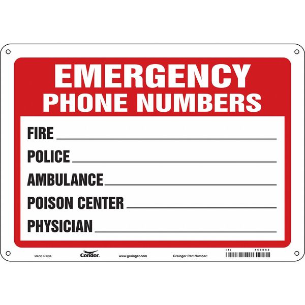 SKU G5597118Categories SafetyDescription SAFETY SIGN FIRE AND EMERGENCY, Horizontal Rectangle, Number of Printed Sides 1, English, Sign Format Other Format, Sign Legend Emergency Phone Numbers Fire _______ Police _______ Ambulance _______ Poison Center _______ Physician _______, Sign Legend Background Color Red, White, Sign Legend Style TextgraingerSKU: 469D82, mscSKU: , zoro_no: G5597118, mongo_id: 65bbe76c3aaddbd5a909388f