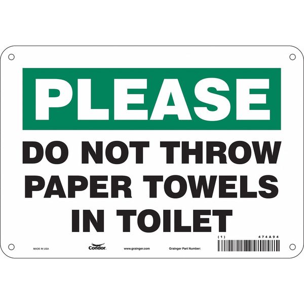 Restroom Sign, 10" W, 7" H, 0.032" Thick, 474A94SKU G5615519Categories SafetyDescription Restroom Sign, Vertical Rectangle, Number of Printed Sides 1, English, Sign Legend Do Not Throw Paper Towels In Toilet, Sign Legend Background Color Green, White, Sign Legend Style TextgraingerSKU: 474A94, mscSKU: , zoro_no: G5615519, mongo_id: 65bbe76c3aaddbd5a9093854