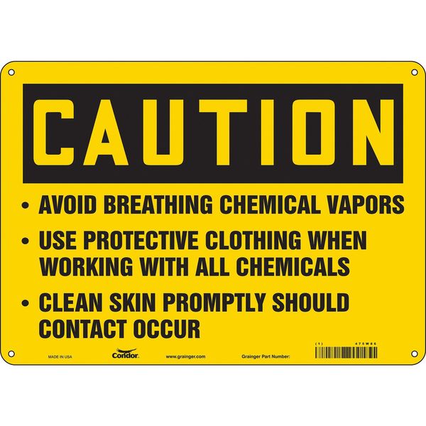 SKU G5849711Categories SafetyDescription Safety Sign, Horizontal Rectangle, Number of Printed Sides 1, English, Sign Format Traditional OSHA, Sign Legend Avoid Breathing Chemical Vapors Use Protective Clothing When Working With All Chemicals Clean Skin Promptly Should Contact Occur, Sign Legend Background Color Yellow, Sign Legend Style TextgraingerSKU: 475W86, mscSKU: , zoro_no: G5849711, mongo_id: 65bbe76d3aaddbd5a909390b