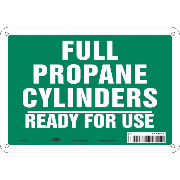 SKU G5597431Categories SafetyDescription Safety Sign, Vertical Rectangle, Number of Printed Sides 1, English, Sign Format Other Format, Sign Legend Full Propane Cylinders Ready For Use, Sign Legend Background Color Green, Sign Legend Style Text Safety Sign, 7 in Height, 10 in Width, Aluminum, Vertical Rectangle, English, 471N40