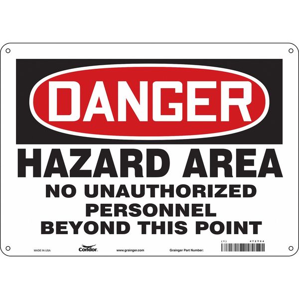 SKU G5813643Categories SafetyDescription Safety Sign, Horizontal Rectangle, Number of Printed Sides 1, English, Sign Format Traditional OSHA, Sign Legend Hazard Area No Unauthorized Personnel Beyond This Point, Sign Legend Background Color White, Sign Legend Style Text Safety Sign, 10 in Height, 14 in Width, Aluminum, Horizontal Rectangle, English, 472T04
