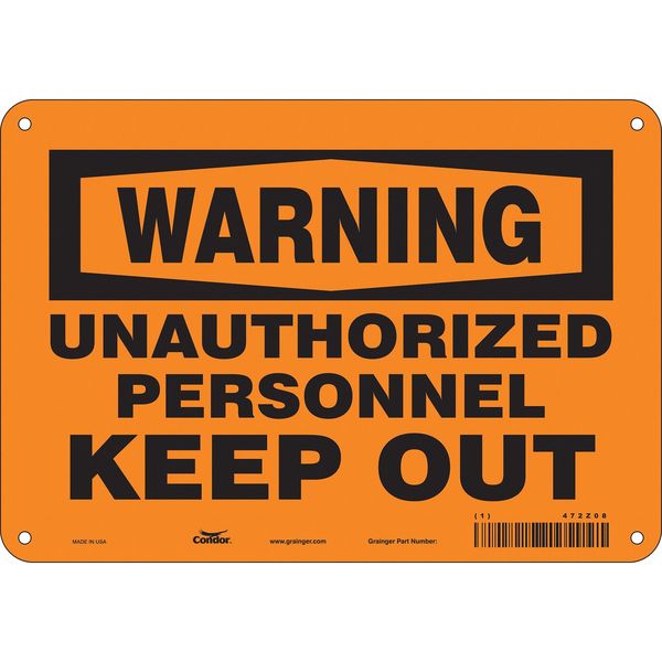 SKU G5216239Categories SafetyDescription Safety Sign, Vertical Rectangle, Number of Printed Sides 1, English, Sign Format Traditional OSHA, Sign Legend Unauthorized Personnel Keep Out, Sign Legend Background Color Orange, Sign Legend Style Text Safety Sign, 7 in Height, 10 in Width, Aluminum, Vertical Rectangle, English, 472Z08