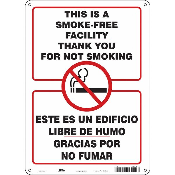 SKU G5072669Categories SafetyDescription Safety Sign, Vertical Rectangle, Number of Printed Sides 1, English, Spanish, Sign Format Other Format, Sign Legend This Is A Smoke- Free Facility Thank You For Not Smoking/Este Es Un Edificio Libre De Humo Gracias Por No Fumar, Sign Legend Background Color White, Sign Legend Style Symbol and Text Safety Sign, 14 in H, 10" W, Vertical Rectangle, English, Spanish, 474L11