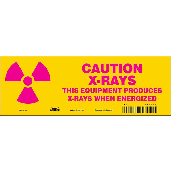 SKU G5507098Categories SafetyDescription Safety Sign, Vertical Rectangle, Number of Printed Sides 1, English, Sign Format Other Format, Sign Legend Caution X-Rays This Equipment Produces X-Rays When Energized, Sign Legend Background Color Yellow, Sign Legend Style Symbol and Text Safety Sign, 3 1/2 in H, 10 in W, Vinyl, Vertical Rectangle, 452A60