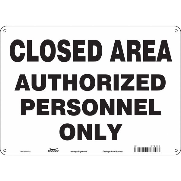 SKU G5094229Categories SafetyDescription Safety Sign, Horizontal Rectangle, Number of Printed Sides 1, English, Sign Format Other Format, Sign Legend Closed Area Authorized Personnel Only, Sign Legend Background Color White, Sign Legend Style Text Safety Sign, 10 in Height, 14 in Width, Aluminum, Horizontal Rectangle, English, 472G64
