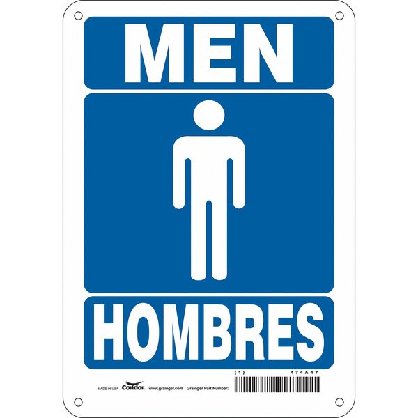 SKU G5621828Categories SafetyDescription Restroom Sign, Horizontal Rectangle, Number of Printed Sides 1, English, Spanish, Sign Legend Men/Hombres, Sign Legend Background Color Blue, Sign Legend Style Symbol and Text Restroom Sign, 7" W, 10" H, 0.032" Thick, 474A47